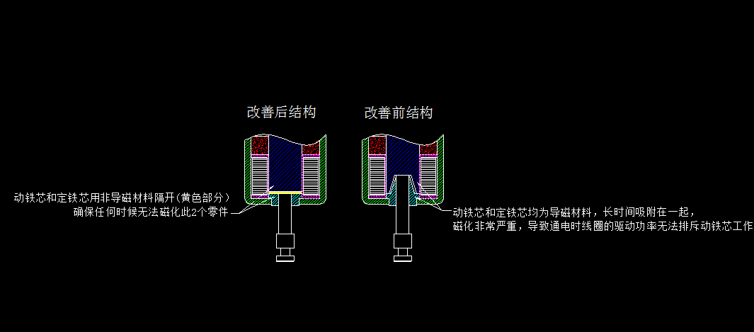 上面是保持式電磁鐵的基本原理,其中動鐵芯需要和鐵芯以及蓋板長時間的接觸(保持時候),動鐵芯和鐵芯都是導磁材料,在通電情況下或者不通電情況下都會被磁化,要讓動鐵芯順暢工作,產生的作用力一定要大于磁化和磁鐵的磁力